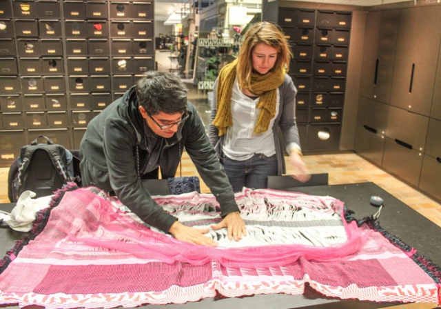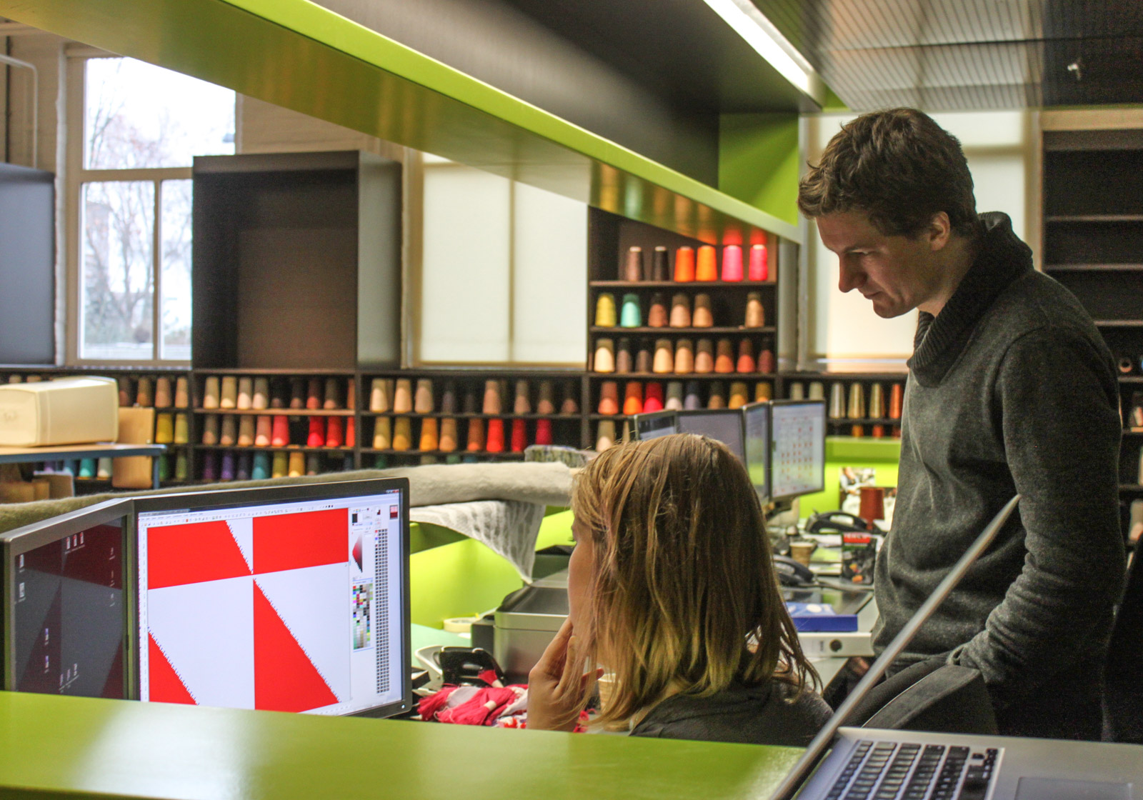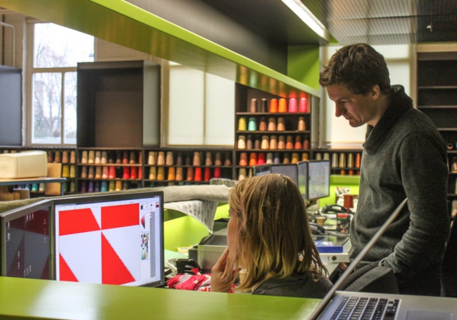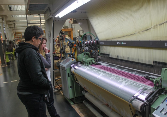 Our weavings are produced on industrial weaving machines at the TextielLab in Tilburg, Netherlands. The gallery below shows some photos taken during a visit when much of the spherical weave structure was developed.